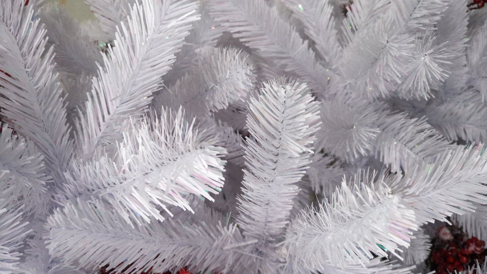 Елочки белого цвета очень удачно вписываются в любой интерьер, несмотря на непривычный цвет. Эта сосна переливается и блестит прямо как снег на свету.