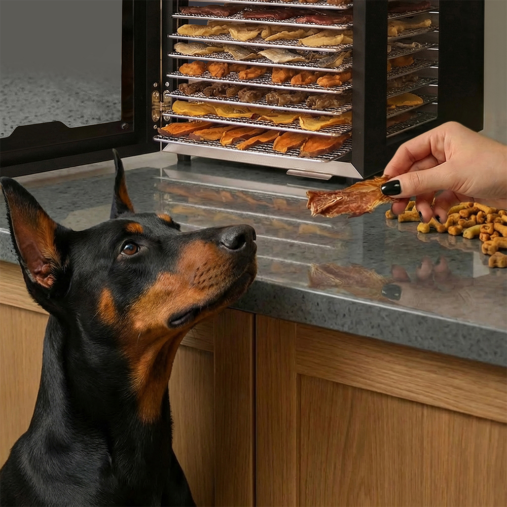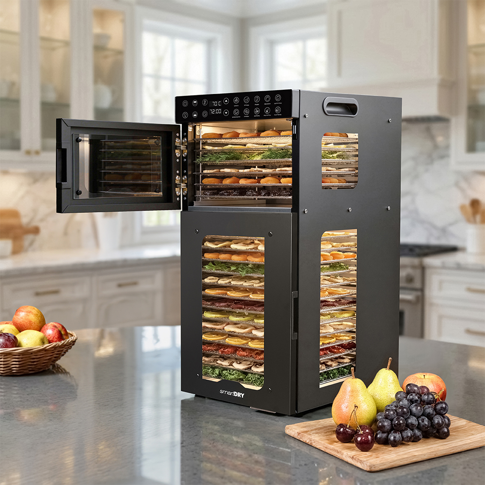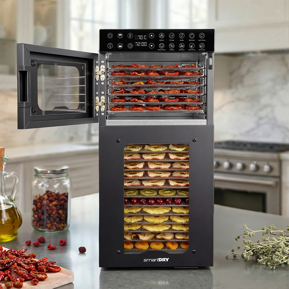 Чёрный корпус из нержавеющей стали, устойчивый к нагреву, влаге и коррозии, выглядит лаконично и современно, легко вписывается в интерьер кухни или мастерской. Внутри установлено 20 поддонов из нержавеющей стали с зазором 25 мм — этого достаточно, чтобы удобно размещать ломтики фруктов, травы или мясные полоски