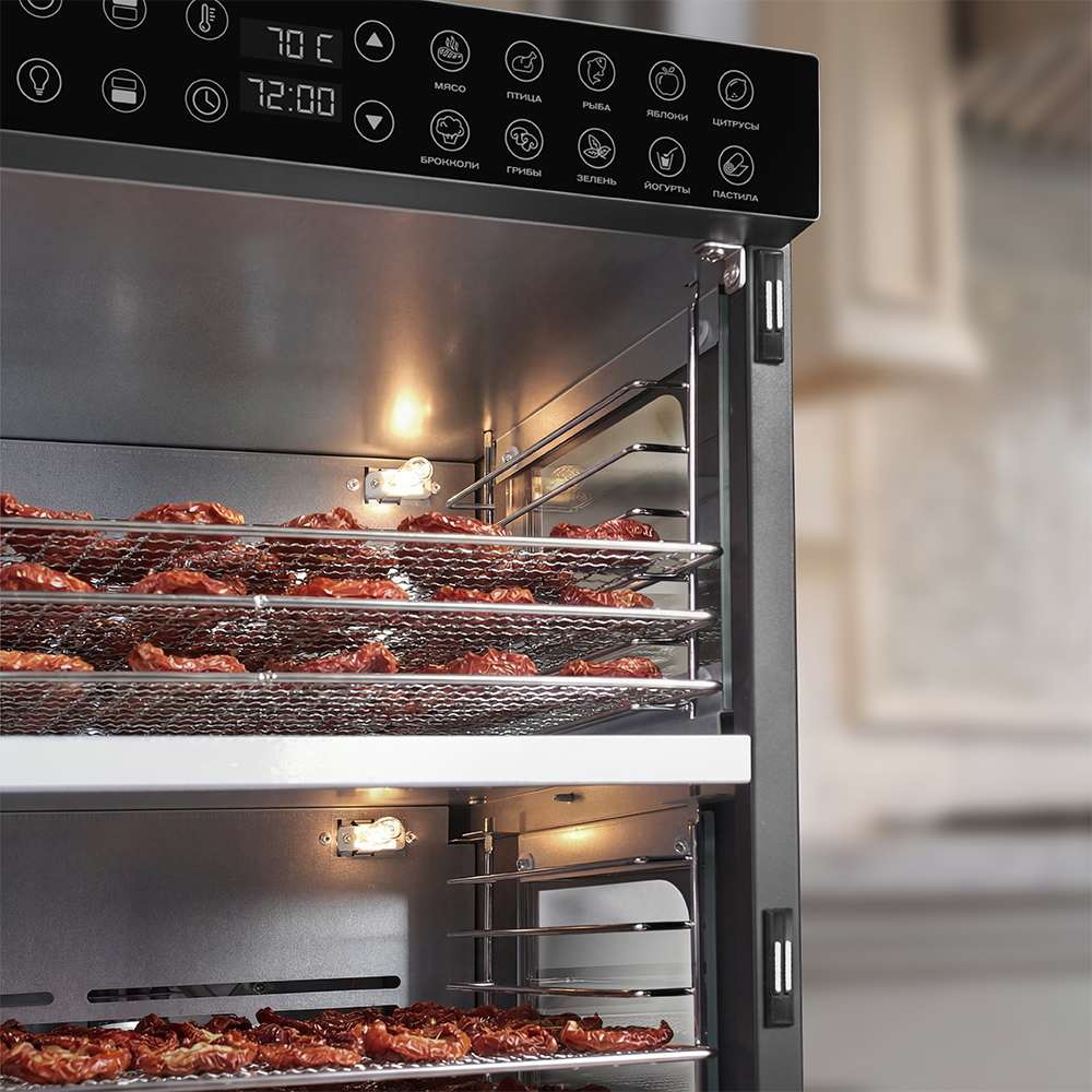 Дегидратор оснащён сенсорной панелью, которая значительно упрощает процесс настройки. Никаких механических рычагов и лишних кнопок — всё управление сосредоточено в одном месте.